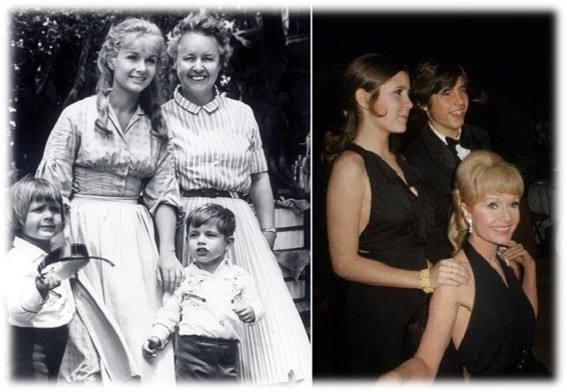 Debbie Raynolds com sua mãe Maxine e os filhos Carrie e Todd nos sets do filme (esquerda) e em evento anos depois (direita).