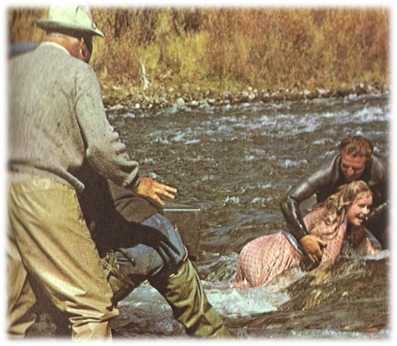 Mergulhador ajuda Debbie Reynolds a sair do rio após cena em que ela dispensou o uso de dublê.