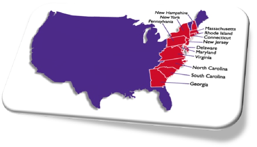 A independência das 13 colônias (acima) iniciaram a expansão da colonização do território norte americano, através de guerras e aquisições de terras como a Flórida (da Espanha), a Louisiana (da França) e Los Angeles (do México).